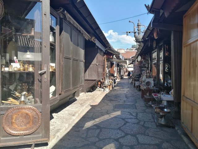 Jednak miasto żyje swoim życiem. Schodzimy na Baščaršija. I charakterystyczny punkt targu - studnia Seblij. Chłoniemy atmosferę, staramy nie skupiać się na uliczkach z kramami (och jak musiałam walczyć ze swoją kobiecą naturą), ale to jest silniejsze od nas.